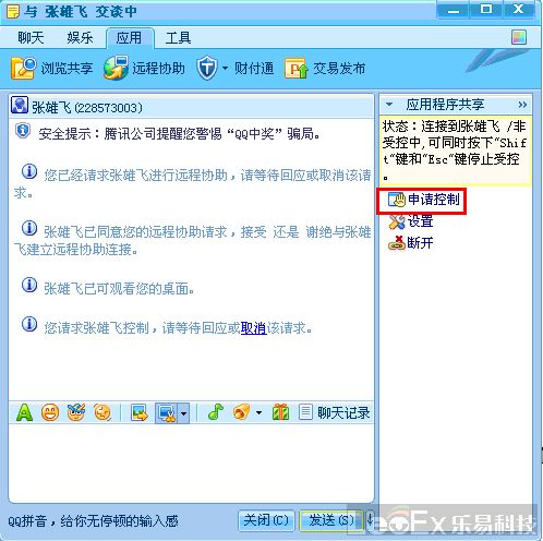 第二步:對話框啟動后,選擇正上方的文字菜單中“應用”菜單,在顯示出來的子菜單中單擊“遠程協助”,等待對方確認。