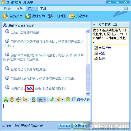 第五步:點擊“請再次確認接受” 的接受按鈕,對方即可操作您的電腦,為您處理軟件問題。