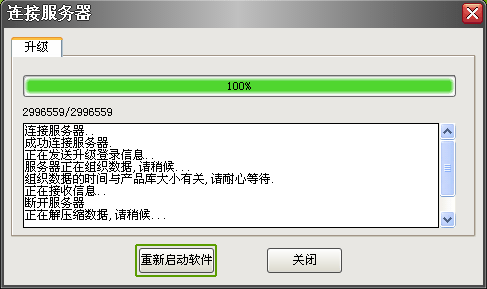 癥狀: 1.升級時提示連接服務(wù)器失敗,斷開服務(wù)器 2.升級到一半提示與服務(wù)器斷開 3.已經(jīng)點擊升級按鈕但是軟件打開還是沒有產(chǎn)品 分析: 軟件的升級與使用的網(wǎng)絡(luò)速度以及產(chǎn)品數(shù)據(jù)大小有關(guān)系。 軟件升級完成會自動提示“重新啟動軟件”。 藥方: 1.網(wǎng)絡(luò)與網(wǎng)絡(luò)之間存在帶寬,如果用戶在升級的軟件同一時候占用大量帶寬,就會導(dǎo)致連接服務(wù)器失敗。建議用戶升級的時候盡量少占用網(wǎng)絡(luò)帶寬。 2.如果用戶本身使用的網(wǎng)絡(luò)速度不是很好或者廠家產(chǎn)品數(shù)據(jù)很大,升級的時候就會出現(xiàn)與服務(wù)器斷開的現(xiàn)象,建議用戶遇到這樣的情況請換個時間升級、使用電信的網(wǎng)絡(luò)升級軟件或者手動下載產(chǎn)品數(shù)據(jù)包。如果一直升級不了,您也可以用U盤到網(wǎng)吧下載注冊升級軟件,升級好拷貝回來。 3.升級軟件時需等升級對話框上的升級按鈕變成“重新啟動軟件”,點擊“重新啟動軟件”后軟件升級完成,打開軟件才能看到產(chǎn)品。如下圖: